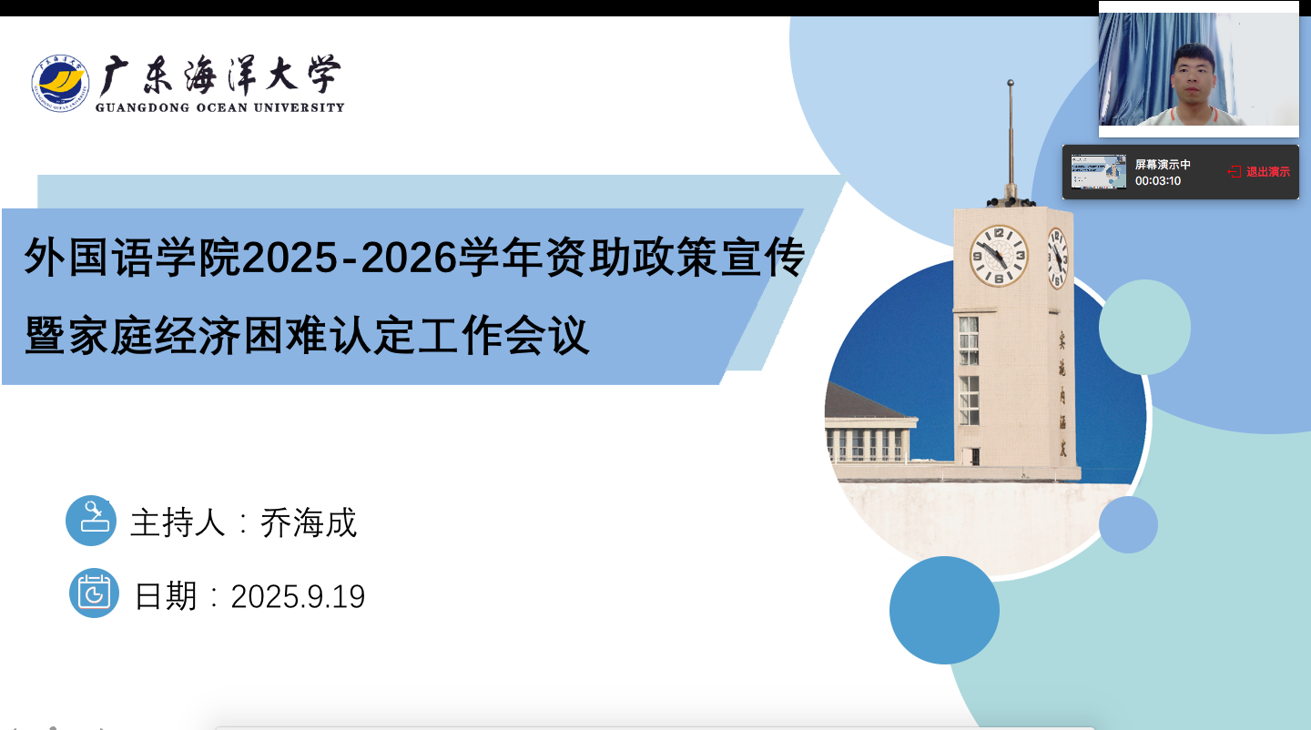 为落实国家及学校资助政策,保障家庭经济困难学生顺利入学、安心就学,外国语学院于2025年9月19日通过企业微信直播,召开“2025年资助政策宣传暨家庭经济困难学生认定工作会议”。会议由学院资助工作负责人乔海成老师主持,各班级生活委员、2025级新生班助、退役士兵学生及有资助申请需求者共200余人在线参会,实现政策宣传与工作部署全覆盖。