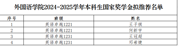 根据《2025年全日制本科生国家奖助学金工作安排》,按照《广东海洋大学全日制本科生国家奖助学金实施办法》(校学生〔2024〕14号)要求,我院开展国家奖学金评选工作。结合学校名额分配,经学生本人申请、学院审核及讨论,评选出国家奖学金4人,现将外国语学院2024-2025学年本科生国家奖学金拟推荐名单进行公示。